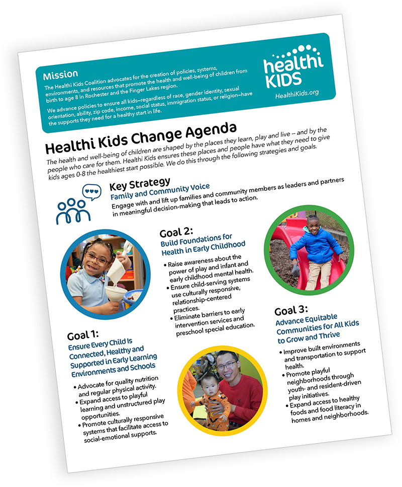 Our change agenda embraces kids and families at the center of all decision making. We advocate to support policies, systems and environmental changes that nurture the physical, social, emotional and cognitive development of kids age 0-8. We do this by focusing on policies that support healthy habit building and healthy relationships, create safe and secure environments and psychological safety, and cultivate skills and competencies of adults who care for children.