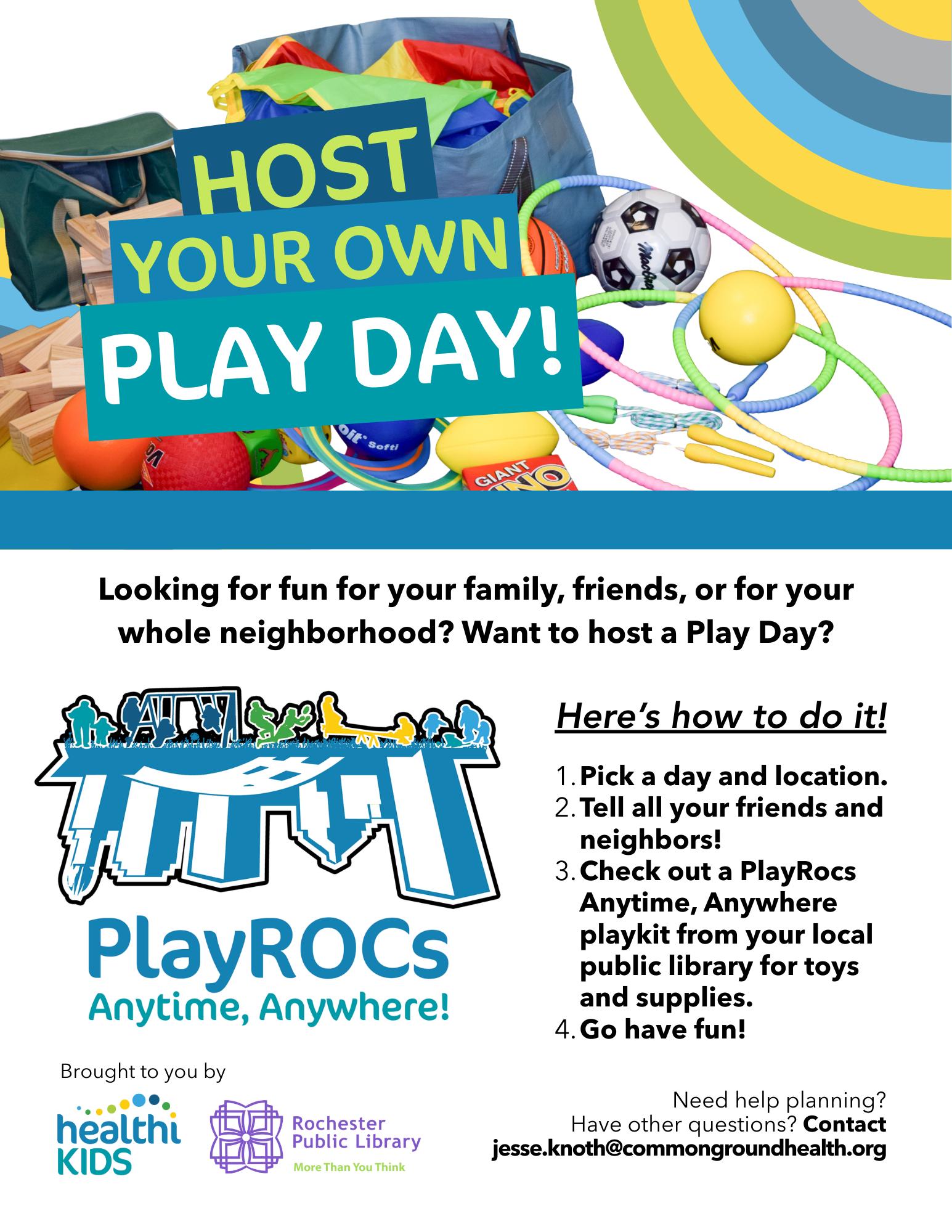 If you have other questions about planning a play day (like "How do I get permission to close my street?"), please contact Jesse Knoth, PlayROCs Project Coordinator, at jesse.knoth@commongroundhealth.org.